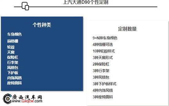 豐富的產(chǎn)品線和車型版本,客戶可根據(jù)自己的喜好與需求私人定制一臺自己的dream car。另外上汽大通D90還分為,手動、自動、兩驅(qū)、四驅(qū)(后驅(qū)、全地形適時四驅(qū)、分時四驅(qū))、3-8座8種不同座椅布局等。