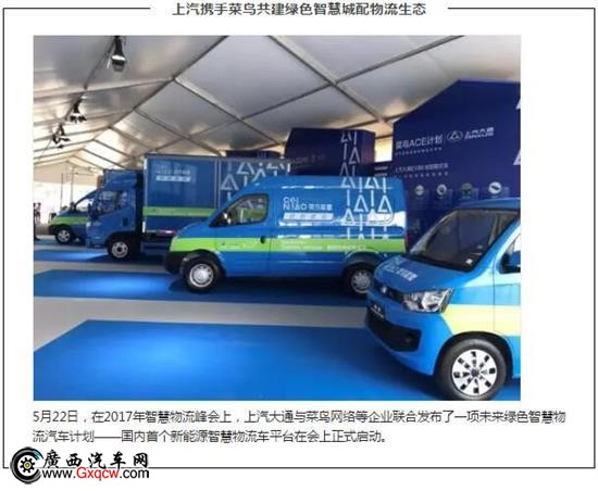 5月22日,在2017年智慧物流峰會(huì)上,上汽大通與菜鳥(niǎo)網(wǎng)絡(luò)等企業(yè)聯(lián)合發(fā)布了一項(xiàng)未來(lái)綠色智慧物流汽車計(jì)劃——國(guó)內(nèi)**新能源智慧物流車平臺(tái)在會(huì)上正式啟動(dòng)。