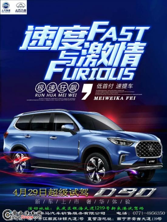 4月29日,上汽大通D90極速狂飆試駕會南寧站火熱招募,現(xiàn)招各路“愛90賞90買90”的人士一同赴宴!一同體驗(yàn)集萬千寵愛于一身的“大塊頭D90”速度與激情。