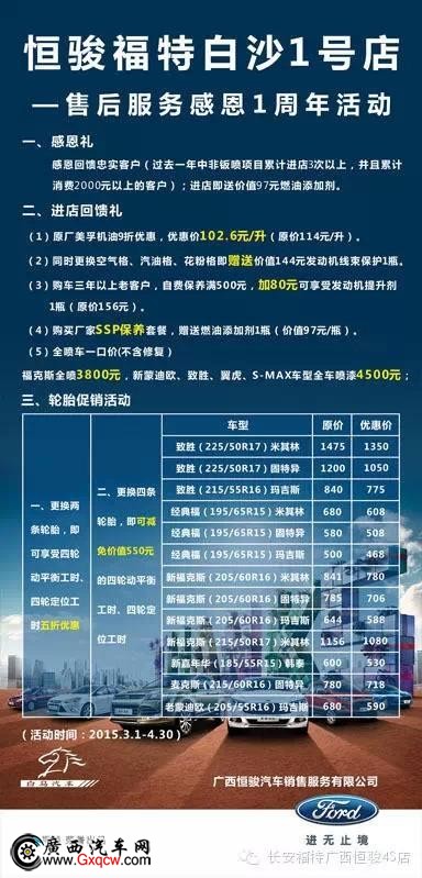為您的駕駛安全與愛車保養(yǎng)出謀劃策同時(shí),也讓您更加了解愛車,更加自如駕車。同時(shí)恒駿福特為您送上暖心回饋!即日起售后客戶即可享受如下“!倍Y: