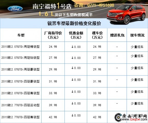 以上為南寧福特車型資料信息,本店提供多項附加增值性服務,讓您享受高品質的服務, 歡迎感興趣的朋友免費致電購車特惠會專線0771-4951698預約品車、試駕, 早日帶走真正屬于您的愛車!