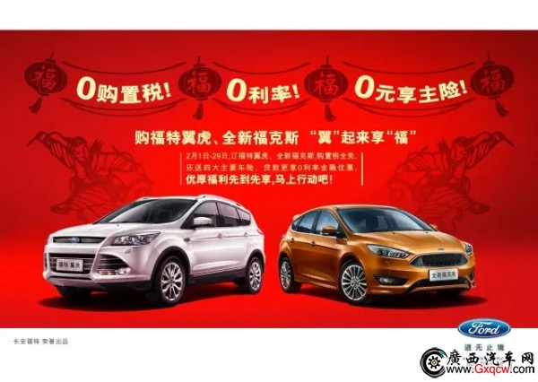 2月1日0:00至2月7日24:00,訂長安福特翼虎、全新福克斯,并在2月1日至29日提車,可得“五福”好禮!