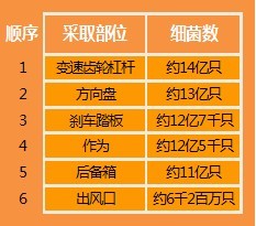 韓國(guó)KBS播出的一個(gè)《逃脫危機(jī)NO.1》節(jié)目里,對(duì)車輛內(nèi)部的細(xì)菌刑警實(shí)驗(yàn)。采取車輛內(nèi)部各部分的細(xì)菌,對(duì)它們進(jìn)行16小時(shí)的配置,把細(xì)菌檢測(cè)結(jié)果到處,結(jié)果如下: