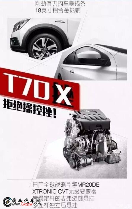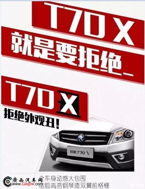 “啟辰T70X擁有高‘顏值’魅力,不僅充分彰顯運動時尚氣質,而且造型設計更適合越野,相信會吸引更多年輕消費者的眼球,引領消費潮流! 啟辰T70X外觀造型上,啟辰T70X散發(fā)出濃郁的運動時尚氣質和個性主張,“男神”魅力勢不可擋。啟辰T70X前臉高亮鋼琴漆雙翼前格柵堪稱一大亮點,再加上剛勁有力的車身線條,凸顯“男神”的型男氣質。