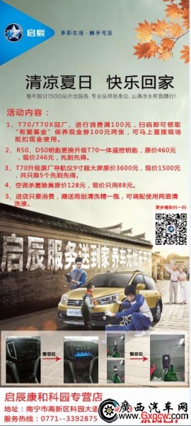 7月2日-3日,賓陽縣花園酒店廣場,啟辰汽車品牌宣傳送服務(wù) ,一次規(guī)?涨暗钠嚻放蒲捕Y 一次品味消費生活的服務(wù)比拼;一次直抵終端的汽車務(wù)實營銷 一次無微不至的行業(yè)品牌服務(wù)