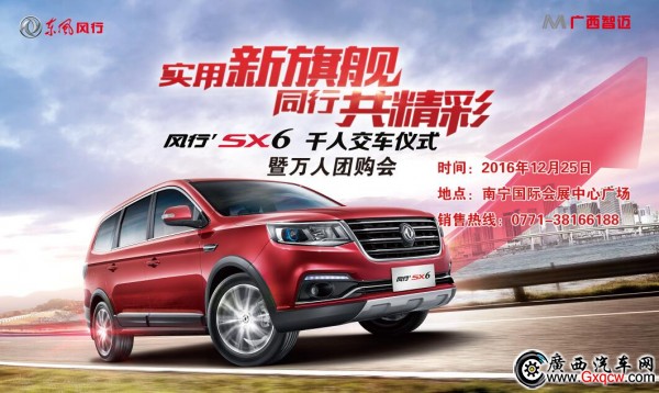 12月25日,南寧站——風(fēng)行SX6千人交車儀式暨全系團(tuán)購會將在會展中心隆重舉行。