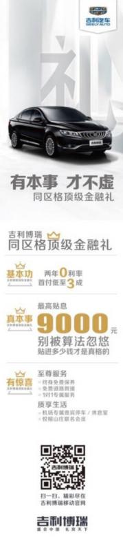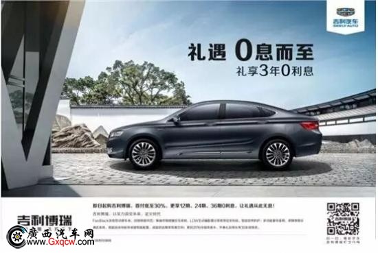 即日起至9月30日,凡至吉利汽車展廳購買吉利博瑞全系車型,*高可享3年0利息,貸款禮遇;