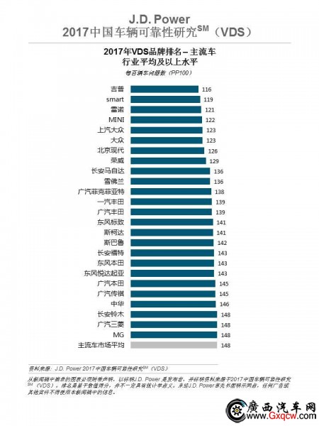 J.D. Power每年都會出一系列有關(guān)汽車的排名,包括新車質(zhì)量、客戶滿意度等,其中有一項很關(guān)鍵的內(nèi)容就是VDS。這項研究,是衡量擁車期在30-48個月內(nèi)的車主在過去12個月期間遇到的問題,包括8個類別(發(fā)動機/變速系統(tǒng)、車身外觀、駕車經(jīng)歷、配置/操控/儀表板、音響系統(tǒng)/內(nèi)置語音識別系統(tǒng)/內(nèi)置免提通訊設(shè)備/導(dǎo)航系統(tǒng)、座椅、空調(diào)系統(tǒng)和車身內(nèi)裝)的177個問題癥狀?傮w可靠性由每百輛車出現(xiàn)的問題數(shù)(PP100)來衡量,分?jǐn)?shù)越低表明質(zhì)量越好。這項研究可以說是消費者購車的重要參考資料,非常具有客觀性,對評估一個品牌、一款車的購買價值極具參考意義。