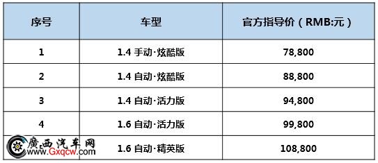 | 車款中文名 | 1.4 手動 炫酷版 | 1.4 自動 炫酷版 | 1.4 自動 活力版 | 1.6 自動 活力版 | 1.6 自動 精英版 |