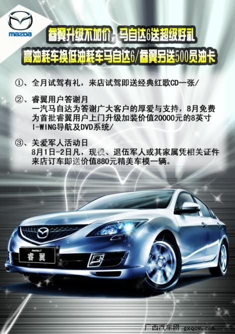 1、凡到店試駕的客戶均可獲贈由鑫廣達一汽馬自達特別為八一建軍節(jié)準(zhǔn)備的經(jīng)典紅歌CD碟一張;