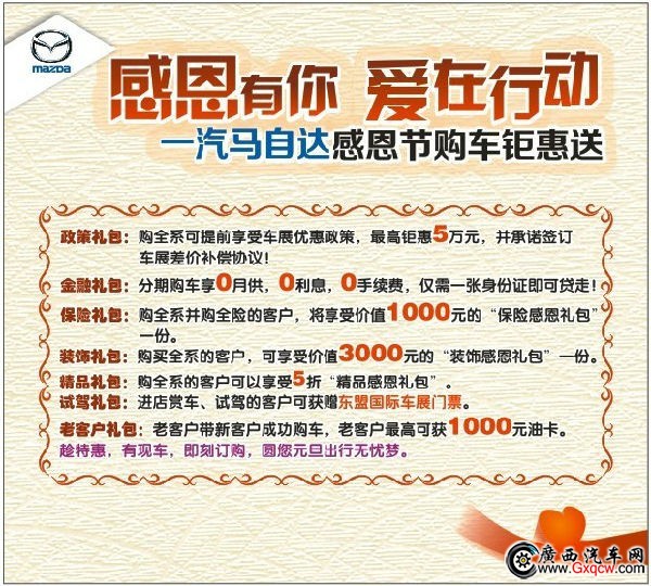 11月28日至12月1日,感恩節(jié),一汽馬自達(dá)感謝新老顧客一路風(fēng)雨同舟,特別舉辦“感恩有你,愛在行動”感恩節(jié)主題活動,凡活動期間購車即享一汽馬自達(dá)感恩節(jié)特惠禮包大派送!