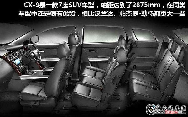 此外,馬自達CX-9還配備了氙氣大燈、電動天窗,LED日行燈、真皮座椅、座椅加熱、20寸輪胎、7英寸觸摸式中控液晶屏(帶GPS導航功能,支持ipod、USB、SD卡等)、電動尾門、可視倒車系統(tǒng)、bose音響等人性化配置,三區(qū)自動空調(diào)、定速巡航。