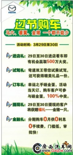 三月購(gòu)車(chē)*后瘋狂,一汽馬自達(dá)廣西鑫廣達(dá)4S店三月再次給力,3月26日-31日推出節(jié)前購(gòu)車(chē)無(wú)憂計(jì)劃。購(gòu)車(chē)送金豬,家用轎車(chē)之王,馬自達(dá)六12.58萬(wàn)起售,購(gòu)“彎道王中王”睿翼送導(dǎo)航,進(jìn)店賞車(chē)即有機(jī)會(huì)贏取500萬(wàn)大獎(jiǎng),訂車(chē)再享幸運(yùn)大抽獎(jiǎng),100%中獎(jiǎng)!優(yōu)惠絕對(duì)震撼,價(jià)格絕對(duì)給“利”,歡迎到店賞車(chē)。
