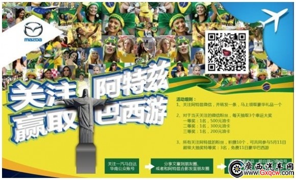 ①即日起,來店客戶和車展客戶,均可通過關(guān)注一汽馬自達(dá)華南大區(qū)微信公眾賬號,只要分享阿特茲文章或人車合影照片至朋友圈,即可到一汽馬自達(dá)4S店或展臺領(lǐng)取豪華禮品一份,更有11日豪華巴西游等你來拿。。