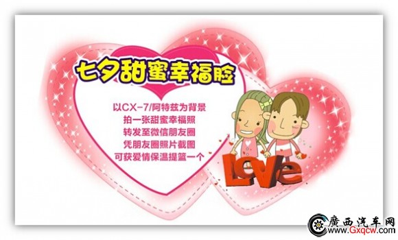 3. 約“惠”幸福禮:活動(dòng)期間,現(xiàn)場(chǎng)到店的朋友、情侶、夫妻以馬自達(dá)CX-7或阿特茲為背景,拍一張兩人的合照,再轉(zhuǎn)發(fā)至微信朋友圈,憑朋友圈的合照截圖可獲得一份七夕禮品;