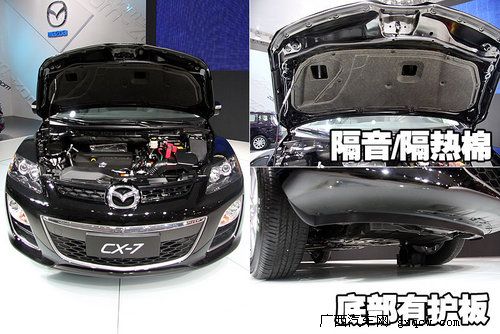 馬自達(dá)CX-7的發(fā)動(dòng)機(jī)艙布局比較規(guī)整,走線合理。在發(fā)動(dòng)機(jī)蓋上輔以隔音材質(zhì),同時(shí)在靠近發(fā)動(dòng)機(jī)后方的部分也設(shè)有隔音、隔熱層。另外車輛裝備了底盤護(hù)板,使馬自達(dá)CX-7在復(fù)雜路面行駛時(shí)其底盤多了一重保護(hù)。馬自達(dá)CX-7是一汽馬自達(dá)以進(jìn)口方式引入的首款SUV車型,這款車在本屆廣州車展一經(jīng)亮相便憑借出色的動(dòng)力性能以及動(dòng)感飽滿時(shí)尚的外形贏得了廣大消費(fèi)者的親睞。那么這款車的做工質(zhì)量如何呢?下面就讓我們一起來(lái)了解一下。