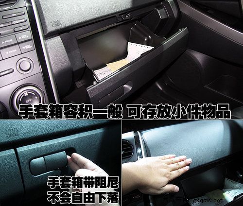 馬自達(dá)CX-7的副駕駛位置的手套箱設(shè)計(jì)有阻尼設(shè)計(jì),打開時(shí)不會(huì)依靠重力自由下落。不過(guò)手套箱的容積一般,只能夠滿足車主日常放置常用物品的需求。