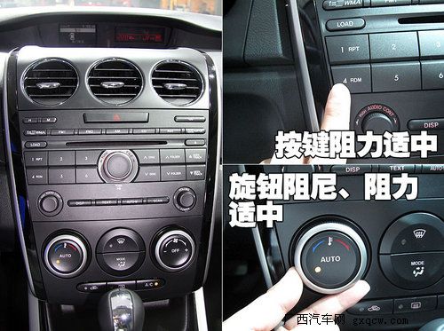 馬自達(dá)CX-7的中控臺(tái)面板采用黑色為主搭配類金屬涂裝,整體設(shè)計(jì)透露著運(yùn)動(dòng)時(shí)尚的氣息,中控臺(tái)的各按鍵、旋鈕在使用中各項(xiàng)調(diào)節(jié)功能均可準(zhǔn)確到位。