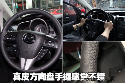 馬自達(dá)CX-7的真皮材質(zhì)的方向盤手握感覺(jué)很好,音響等操控裝置集中置于方向盤上,駕駛時(shí)只要對(duì)方向盤上的按鍵進(jìn)行簡(jiǎn)單操作,按鍵四周的做工非常細(xì)致。