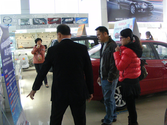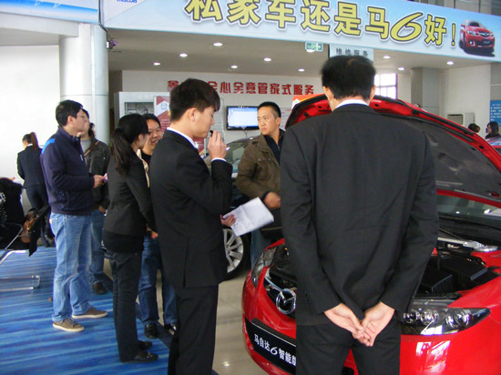 銷售顧問激情飽滿的為現(xiàn)場(chǎng)的客戶朋友做智能版馬六的性能介紹