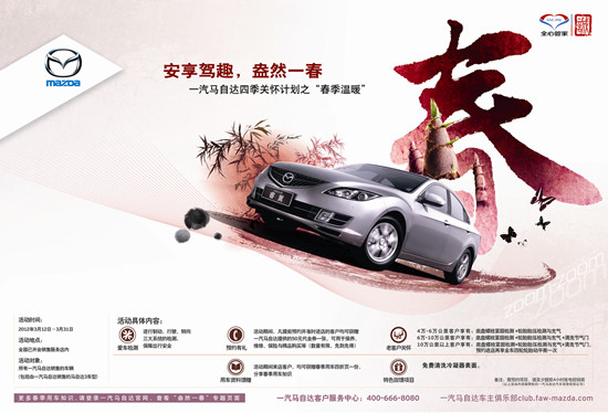 本次“安享駕趣•盎然一春”活動(dòng)是一汽馬自達(dá)“四季關(guān)懷計(jì)劃”的重要部分,2012年是一汽馬自達(dá)的“服務(wù)品牌年”,“四季關(guān)懷計(jì)劃”本著“至誠無昧、至意誠心、達(dá)誠申信、赤誠相待、抱誠守真”的態(tài)度,力求讓近70萬一汽馬自達(dá)車主感受到了“全心管家式服務(wù)”的細(xì)致與溫暖。
