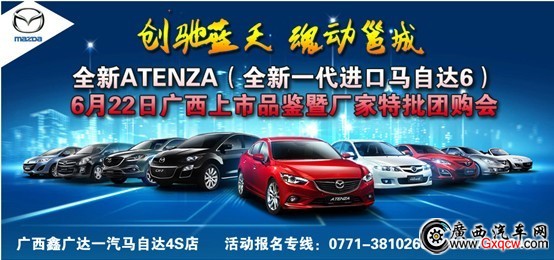 創(chuàng)馳藍天?魂動邕城,全新ATENZA(新一代進口馬自達6)現已到店,6月22日(本周日上午10.30分)鑫廣達一汽馬自達將舉辦該車廣西上市品鑒會暨廠家團購會,歡迎到店鑒賞!ATENZA――2013年最值得期待的全新車型,應用創(chuàng)馳藍天技術,更時尚、更省油、更豪華、更高檔。活動當日一汽馬自達全系車型享受廠家團購政策,優(yōu)惠額度今年最低。