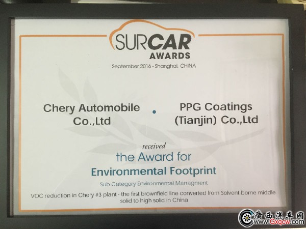 近日,在國際汽車涂裝研討會(SURCAR)每兩年舉辦一次的行業(yè)創(chuàng)新表彰大會上,奇瑞汽車憑借先進的“涂裝高固工藝”改造項目從眾多提案中脫穎而出,獲得了國際汽車涂裝研計會(SURCAR)“ Environmental Footprint”(環(huán)境足跡)獎。