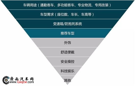 在V80的選配器中,客戶首先選擇三個問題先進行操作,分別是車輛用途,車型需求,變速箱/防抱死系統(tǒng)。車輛用途中有通勤客戶、多功能客車、專業(yè)物流、專用改裝等選項進行選擇,車型需求中有座位數(shù)、車長、車高等選項進行選擇,當(dāng)這個三個基本選項選擇完成之后,選配器會根據(jù)客戶的選擇推薦出兩到三款車型讓客戶進行選擇。在推薦的車型的基礎(chǔ)上,客戶再進行外飾、舒適便捷、安全操控、科技娛樂和其他的選擇,最終選出符合自己心意的車輛。整個選配器選擇過程邏輯清晰、設(shè)計科學(xué)、容易理解、操作便捷,能夠快速的幫助客戶選擇。