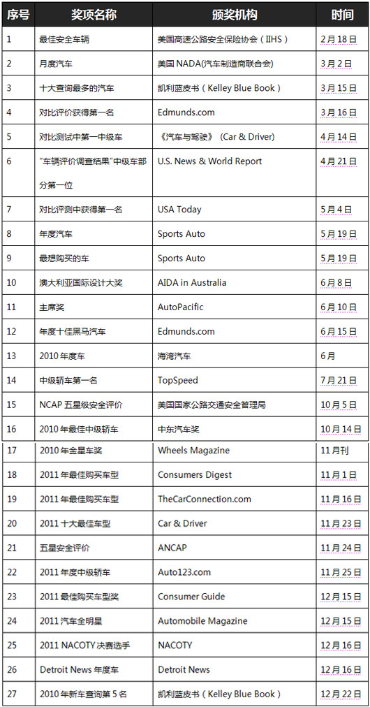 2010年4月,在《汽車與駕駛》(Car & Driver)比較評(píng)價(jià)中,力壓本田雅閣、斯巴魯力獅,獲得**位;2010年5月~10月,分別獲得 “年度汽車”、“最想購(gòu)買的車”、“2010年**中級(jí)轎車”等獎(jiǎng)項(xiàng)。同時(shí)還獲得美國(guó)國(guó)家公路交通安全管理局NCAP五星級(jí)安全評(píng)價(jià)。此外,還有“美國(guó)中高級(jí)轎車綜合評(píng)測(cè)”**名和澳洲NCAP 5星評(píng)價(jià)等等。據(jù)統(tǒng)計(jì),2010一年,第八代索納塔在海外共攬獲27項(xiàng)大獎(jiǎng),堪稱載譽(yù)而歸。