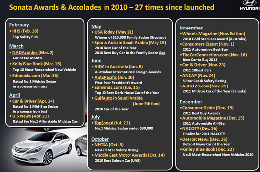 “**安全車輛”、“2010年度汽車”、“最想購(gòu)買的車”……預(yù)計(jì)今年4月8日在國(guó)內(nèi)上市第八代索納塔,2010年在海外共攬獲27項(xiàng)大獎(jiǎng),其中不乏歐美媒體年度車獎(jiǎng)及權(quán)威評(píng)測(cè)機(jī)構(gòu)的五星級(jí)安全認(rèn)定。