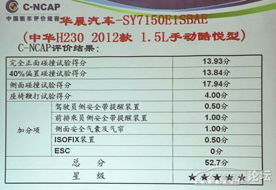 2013年7月12日,中國汽車技術(shù)研究中心在天津發(fā)布了2013年度C-NCAP第二批車型的評(píng)價(jià)結(jié)果。中華H230在完全正面碰撞測試、40%偏置碰撞測試、側(cè)面碰撞測試及鞭打測試中均表現(xiàn)優(yōu)異,獲得五星評(píng)價(jià)。