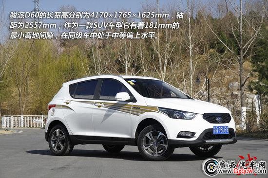 駿派D60的車身尺寸方面,長寬高分別為4170×1765×1625mm,軸距為2557mm,并且作為一款SUV車型,它也有著181mm的最小離地間隙,在同級車中處于中等偏上水平,雖然這樣的尺寸并不適合深度越野,但是這樣的離地間隙也讓駿派D60絕對不是一個花架子。轉播到騰訊微博