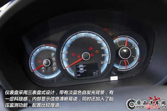 儀表盤采用三表盤式設計,帶有淡藍色自發(fā)光背景,有一定科技感,內部顯示信息清晰易讀,同時還加入了胎壓監(jiān)測功能,配置比較厚道。