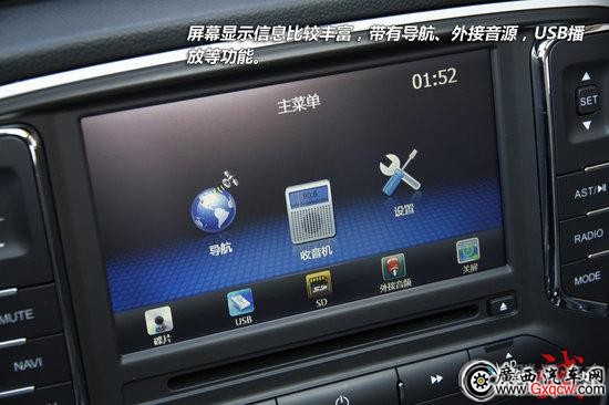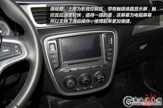 中控臺區(qū)域整體向駕駛員一側傾斜,內部帶有銀色裝飾條點綴,使得該區(qū)域很規(guī)整,上部為影音控制區(qū),帶有觸摸液晶顯示屏,觸控反應速度較快,值得一提的是,該屏幕為電阻屏幕,所以支持了滑動操作,使用起來更加便捷。