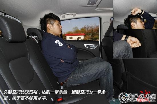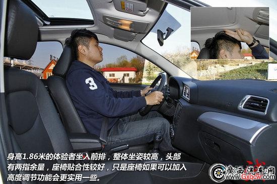 乘坐空間方面,身高1.86米的體驗者坐入前排,整體坐姿較高,頭部有兩指余量,座椅貼合性較好,只是座椅如果可以加入高度調節(jié)功能會更實用一些。