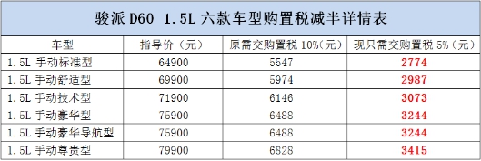假設(shè),有幸哪位小公舉五折秒殺了一臺駿派D60 1.5L手動標準型,購車款只需付32450元。加上駿派D601.5L所有車型,均可以享受國家10月起頒發(fā)的關(guān)于“購買1.6升及以下排量乘用車實施減半征收車輛購置稅”的優(yōu)惠政策。五折秒殺的駿派D60 1.5L手動標準型,同樣享受購置稅減半政策,即2774元。