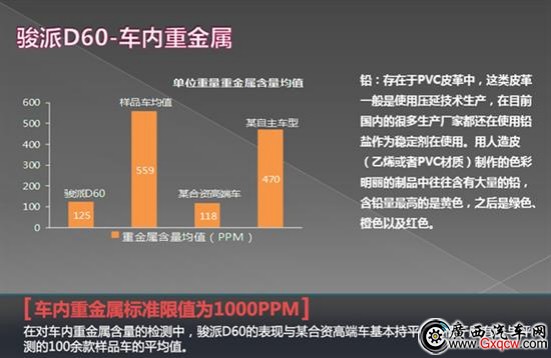 國內**的汽車專業(yè)問答網(wǎng)站“車問網(wǎng)”對駿派D60車內環(huán)境進行了檢測。檢測報告顯示,在對車內重金屬含鉛量的檢測中,駿派D60憑借125PPM的成績,遠低于樣品車的平均值。鉛元素含量控制在和雷克薩斯CT200h以及豐田普銳斯這兩個排名靠前的豐田系車型相同的水準。