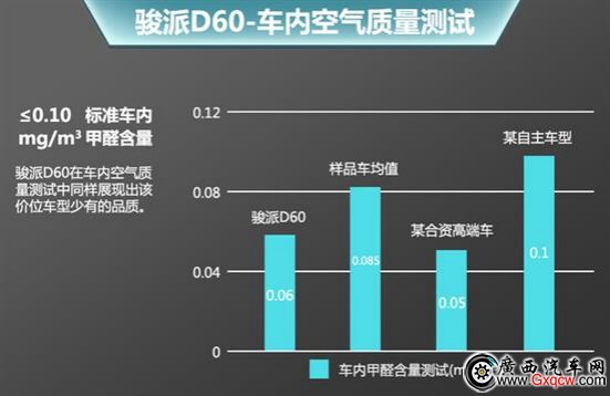 與此同時,駿派D60在甲醛含量方面也取得了不錯的成績:每立方米0.06毫克的甲醛含量水平僅為國家標準值上限的60%。甲醛含量控制在和豐田凱美瑞相同的水準。