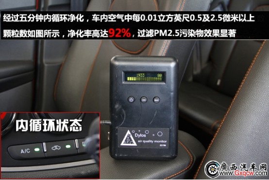 *后開啟空調內循環(huán)對車內空氣進行凈化,5分鐘后用同樣的方法進行測試。測出的結果顯示每0.01立方英尺空氣中直徑0.5微米以上大小顆粒數(shù)約為1933、直徑2.5微米以上大小顆粒數(shù)約為80。內循環(huán)狀態(tài)下污染顆粒凈化率為92%,駿派D60過濾PM2.5污染物的能力相當出色。
