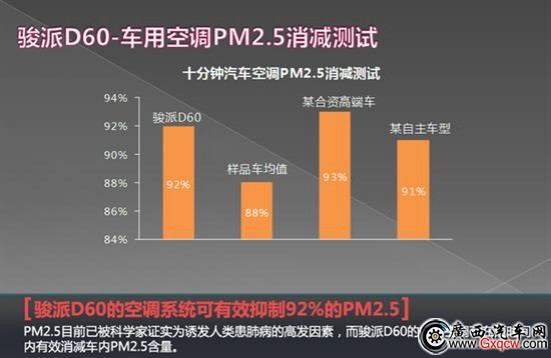 真實的數(shù)據(jù)表明,駿派D60空調系統(tǒng)在內循環(huán)狀態(tài)下,其過濾PM2.5效果作用還是相當理想的。對比車問網(wǎng)2014年度曾發(fā)布過的20款車型PM2.5消減測試報告,駿派D60車載空調過濾PM2.5的能力已經和排名**的豐田銳志十分接近,甚至超過了以車內空氣清潔著稱的沃爾沃S60車型。