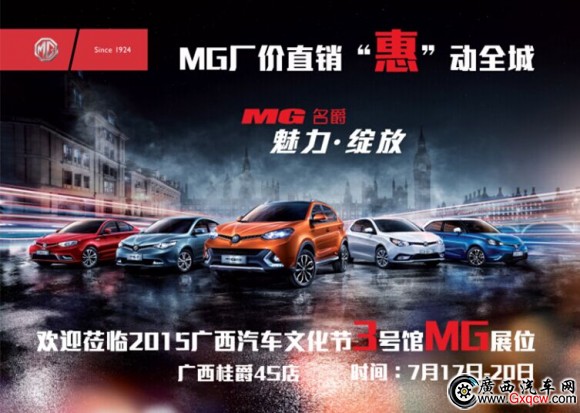 2015年7月17日-20日,2015第四屆廣西國際汽車文化節(jié)車展將在南寧國際會展中心隆重舉行。屆時廣西桂爵MG攜手名爵銳騰、MG3、名爵銳行、MG6、MG5隆重登場,并帶來下半年伊始**場最為瘋狂、最為徹底的購車鉅惠風暴。車展期間購車即可享受以下多重禮遇: