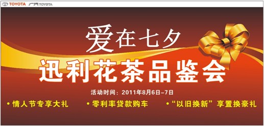 七夕,原名為乞巧節(jié)。相傳,在每年農(nóng)歷七月初七的夜晚,是天上織女與牛郎在鵲橋相會(huì)之時(shí),F(xiàn)在,我們更多的是開著自己的愛車,帶著家人,選擇涼爽的日子出去游玩,體驗(yàn)?zāi)欠菹矏偟臉啡ぁ?br /> 8月6-7日,廣汽豐田迅利江南店將在展廳內(nèi)舉辦花茶品鑒會(huì),讓您在炎熱夏日不止可以輕松賞車,更有機(jī)會(huì)品嘗各種花茶,清涼一夏,另外凱美瑞周末半價(jià)提車,老客戶轉(zhuǎn)介紹更送千元豪禮,同時(shí)針對(duì)各車型更推出八重禮,難得的機(jī)會(huì),還等什么,趕快來分享購(gòu)車的喜悅。
