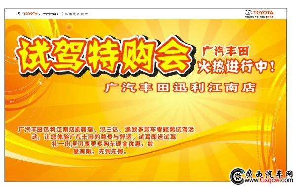 很多事,嘗試過才知道,很多人,體驗后才更深刻。車也一樣!即日起,廣汽豐田迅利江南店凱美瑞、漢蘭達(dá)、逸致、雅力士多款車提供零距離試駕活動,讓您體驗廣汽豐田的尊貴與舒適。試駕即送廣汽豐田專屬試駕禮一份,更可享更多購車現(xiàn)金優(yōu)惠,優(yōu)惠價格直探全市*低價。