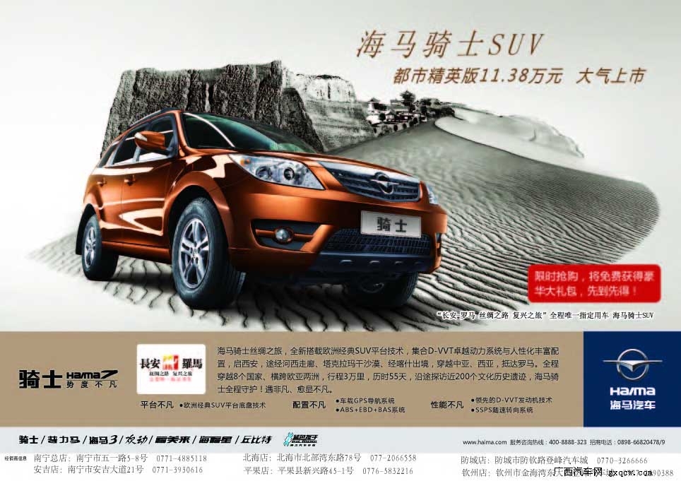 7月26日,在南寧?灯囦N售有限公司一直受到消費(fèi)者好評的海馬騎士SUV推出了新型號――價(jià)格為11.38萬元的都市精英版。該型號相比高配置的智能領(lǐng)航版,價(jià)格低了2萬元以上。 記者在海馬汽車?4S店了解到,本次上市的都市精英版是針對都市商務(wù)精英推出的版本。并針對精英們的實(shí)際需求,對其配置和裝備進(jìn)行了針對性的全新調(diào)整,以實(shí)用的配置組合延續(xù)了海馬騎士的高性價(jià)比;同時(shí)騎士的這一車型仍將繼承智能領(lǐng)航版舒適的駕乘感受、出色的操控性能、全面周到的安全配置、卓越的品質(zhì)以及行政級的內(nèi)飾等優(yōu)勢,為消費(fèi)者提供了一個(gè)新的選擇。隨著都市精英版的上市,海馬騎士SUV對于10-15萬元的SUV市場勢必形成更為更強(qiáng)大的沖擊力,自主品牌終于有了和眾多韓系SUV一分高下的好產(chǎn)品。 挾高性價(jià)比 成“韓系SUV殺手” 海馬騎士SUV自今年4月份上市以來,憑借13.58萬元的智能領(lǐng)航版,迅速在中高端SUV市場上站穩(wěn)了腳跟。以往在10-15萬元的市場上,一直沒有自主品牌車型的身影。尤其在SUV市場上,這個(gè)價(jià)格區(qū)間基本被途勝、獅跑等以韓系SUV為代表的產(chǎn)品所占據(jù)。10萬元,也成為了自主品牌價(jià)格的天花板。騎士的智能領(lǐng)航版在這個(gè)自主品牌從來沒有進(jìn)入過的市場上,殺出了一片市場,贏得了消費(fèi)者的認(rèn)可。 由于智能領(lǐng)航版的成功推出,騎士都市精英版在未上市前就受到了消費(fèi)者的關(guān)注。XX地的SUV愛好者薛先生說,“在北京車展上市之后,我就一直關(guān)注騎士的新版本上市。我已經(jīng)看了都市精英版的配置,非常高,比韓系車的性價(jià)比高出很多。騎士,不愧是自主品牌**車型”。 如薛先生所言,此次都市精英版針對個(gè)人商務(wù)以及家庭用車的需求,對配置和裝備進(jìn)行了的調(diào)整,在動(dòng)力、底盤、安全配置方面則保持了騎士一貫的高水準(zhǔn),都市精英版將確保消費(fèi)者享受到海馬騎士所帶來的舒適的駕乘感受、出色的操控性能、全面周到的安全配置、卓越的品質(zhì)以及行政級的檔次感。而11.38萬元的價(jià)格,使得海馬騎士都市精英版相比同級別的韓系車,無論從配置還是動(dòng)力操控等各個(gè)方面,都具有明顯的優(yōu)勢,全面滿足了個(gè)人SUV市場對產(chǎn)品高性能、高品質(zhì)和高性價(jià)比的綜合需求。 “現(xiàn)在的自主品牌在品質(zhì)上正越來越接近合資品牌。而海馬的品質(zhì)則完全就是合資品牌的品質(zhì)。因?yàn),海馬作為合資企業(yè)的時(shí)間,比其他自主品牌的時(shí)間更長。海馬完全有能力做出合資水準(zhǔn)的車型。所以,作為海馬旗艦車型的騎士,一定是代表了自主品牌*高水準(zhǔn)。11.38萬的有力價(jià)格,騎士的確堪稱韓系SUV殺手”。XX地一位資深的汽車媒體人士評價(jià)說。 SUV市場火爆,騎士正當(dāng)其時(shí) 今年車市,SUV非常火爆,增幅超過100%。而海馬騎士生逢其時(shí),推出了智能領(lǐng)航版和都市精英版兩個(gè)車型,在車市最有潛力的SUV市場上,成為了有力的爭奪者。 更重要的是,此次海馬進(jìn)入SUV市場,沒有遵循自主品牌一向的低價(jià)路線,而是直接從10-15萬元這個(gè)韓系SUV主導(dǎo)的價(jià)格區(qū)間進(jìn)入。從4月份北京車展上市以來,騎士成功塑造了自主品牌高端SUV的形象,并且也樹立了“韓系SUV殺手”的形象。 7月19日,騎士正式成為了絲綢之路申遺活動(dòng)的指定用車,將從西安出發(fā),驅(qū)車3萬里至羅馬。之所以在眾多競爭車型中選擇騎士作為指定用車,活動(dòng)主辦方負(fù)責(zé)人說,“此次從西安到羅馬,跋山涉水,對車輛性能要求非常高,來不得半點(diǎn)虛假。在眾多車型中,我們進(jìn)行了大量的嚴(yán)格篩選,最終認(rèn)定海馬騎士SUV的品質(zhì)過硬,完全可以承擔(dān)3萬里的嚴(yán)苛考驗(yàn)! 看來騎士之所以能夠在南寧市場銷售火爆,不僅是因?yàn)镾UV市場火熱的原因,更是因?yàn)楹qR騎士本身的魅力所在。