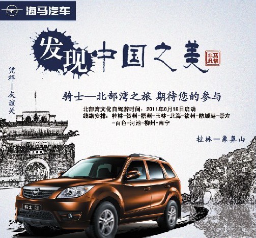 與傳統巡展活動不同的是,“騎士之旅•發(fā)現中國之美”結合了“絲綢之路騎士之旅”成果展、“發(fā)現中國之美”區(qū)域特色路線試駕等眾多元素,是一次全國性的立體化巡展活動,也是海馬騎士文化營銷戰(zhàn)略的一次新嘗試。