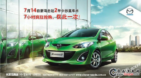廣西弘駿長安馬自達(dá)金源店7月14日10:00至17:00新馬自達(dá)2年中抄底車市,7小時瘋狂搶購,**一次!新馬自達(dá)2僅85800元起搶!搶!搶!全場僅限4臺,7月14日上午10:00火爆開場!詢0771-3225588.