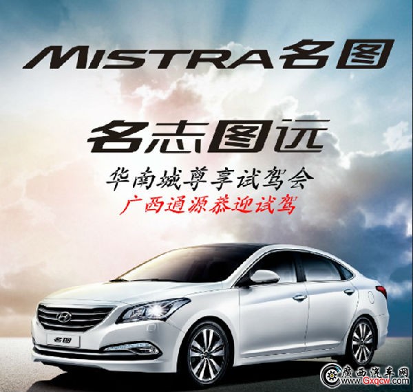歡樂(lè)駕購(gòu),為車(chē)瘋狂。2013.12.28日MISTRA名圖尊享試駕會(huì)于南寧華南城激情啟動(dòng)!當(dāng)日還有最激烈的賽車(chē)比賽,最考驗(yàn)技巧的繞樁,精彩節(jié)目等著你!廣西通源恭迎您到場(chǎng)試乘試駕到場(chǎng)參賽!