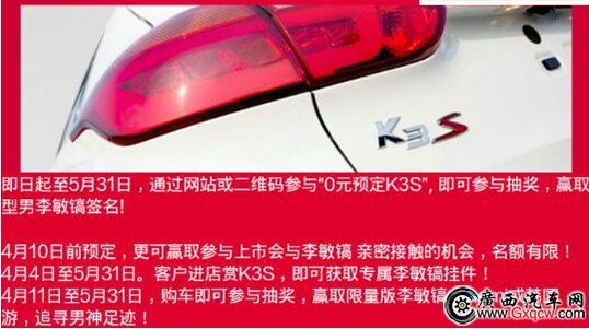 通過(guò)網(wǎng)站或掃描二維碼參與“0元預(yù)定K3S”即可參與抽獎(jiǎng)活動(dòng),贏取男神李敏鎬親筆簽名照片。4月10日前預(yù)定,有機(jī)會(huì)贏得參與K3S上市會(huì)的機(jī)會(huì)與李敏鎬近距離接觸!