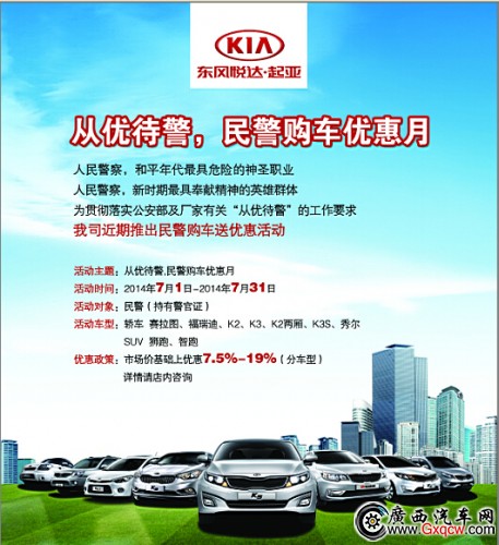 為貫徹落實(shí)公安部及東風(fēng)悅達(dá)起亞廠家有關(guān)“從優(yōu)待警”的工作要求,我司近期推出民警購(gòu)車(chē)送優(yōu)惠活動(dòng):