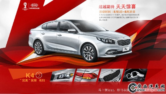 K4是起亞向****的一款D1級(jí)別車(chē),它是由**在職的世界著名三大設(shè)計(jì)師之一的彼得•希瑞爾設(shè)計(jì),定位為C2級(jí)別的價(jià)格,D2級(jí)別的外觀與內(nèi)部空間。外觀動(dòng)感時(shí)尚,線條優(yōu)美。其溜背式造型、腰線設(shè)計(jì)、輪圈樣式,尾燈設(shè)計(jì)簡(jiǎn)潔而美觀,車(chē)身雙側(cè)單出的四邊形排氣孔顯得非常有力量感,外觀充滿優(yōu)雅和干練美,是時(shí)尚并重視品味的城市精英的首選。8月5日-8月31日東風(fēng)悅達(dá)起亞南寧通惠4S店預(yù)定活動(dòng)已全面火爆進(jìn)行了,還在等什么,趕快報(bào)名了,早訂更劃算哦。預(yù)定禮:凡在活動(dòng)期間預(yù)訂K4的客戶,自訂車(chē)日起至交車(chē)之日止享受每日贈(zèng)送10L汽油的預(yù)定禮。(*高可送250升),詳詢東風(fēng)悅達(dá)起亞南寧通惠4S店:0771-2244 666,地址:南寧市白沙大道69號(hào)(白沙友誼立交旁)。